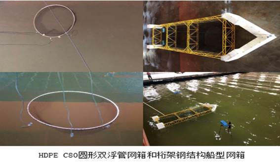 為了解和掌握深水網(wǎng)箱在各種海況條件下的水動力特性,獲取臺風等級海況深水網(wǎng)箱系統(tǒng)主要部件的力學相關數(shù)據(jù),為網(wǎng)箱選址、設計、選型、安裝提供關鍵數(shù)據(jù)支撐。中國水產(chǎn)科學研究院江蘇如東試驗基地承接我院南海所項目,于2018年4月1日-2018年7月20日進行了HDPE C80圓形雙浮管網(wǎng)箱的錨繩受力峰值的試驗研究。于2018年10月1日至今進行桁架鋼結構船型網(wǎng)箱物理模型試驗研究。